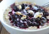 Каша будет намного вкуснее, если ее подавать с черничным соусом и орехами.