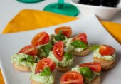 Затейливый пышный бутерброд, основанный на классических сочетаниях итальянской кухни. Большое количество составляющих формирует насыщенный по вкусу ансамбль.