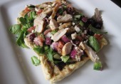 Греческая пицца с куриным филе, вялеными помидорами, оливками каламата, луком, шпинатом и сыром фета.