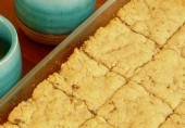 Вкуснейший масляный пирог с грецкими орехами, разрезанный на квадратики и политый сладким сиропом.