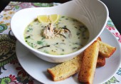 Суп с курицей, пастой орзо, обжаренными грибами, морковью, шпинатом и сливками.
