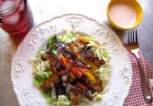 Пшеничные лепешки с начинкой из куриного филе с зеленым перцем чили, сальсой, коричневым сахаром и спрайтом.