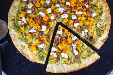 Готовим необычную пиццу с мускатной тыквой, панчеттой (разновидность бекона) и козьим сыром.