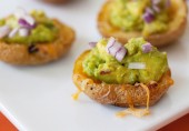 Запеченный картофель с панчеттой, чеддером, гуакамоле и красным луком.