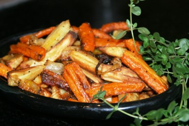Морковь, пастернак и лук, сбрызнутые оливковым маслом и запеченные в духовке. При желании можно добавить тимьян.