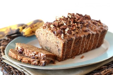Сладкий банановый хлеб из цельнозерновой муки с корицей и пеканами, покрытый сладкой коричной глазурью.