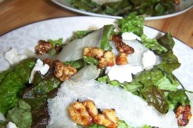 Обжаренный в масле с медом пекан, груша и козий сыр, выложенные на листья латука и сбрызнутые бальзамическим уксусом.