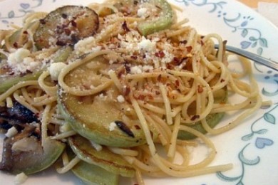 Спагетти с обжаренными в масле кабачками, чесноком и сыром.