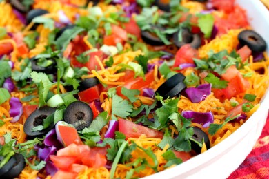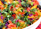 Энчилада из пшеничных (или кукурузных) лепешек со свежей кукурузой, чеддером, фасолью, оливками и сальсой, запеченная в духовке.