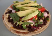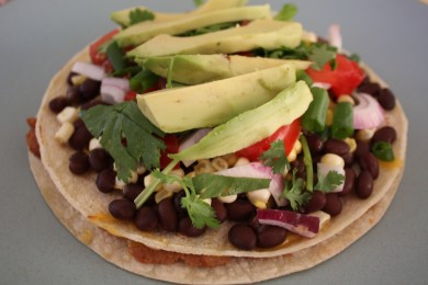 Пшеничные лепешки с сыром, консервированной фасолью, кукурузой, помидорами и авокадо.