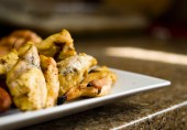 Куриные окорочка, маринованные в оливковом масле с чесноком, солью, тмином, халапеньо и куркумой и обжаренные на гриле.