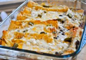 Энчилада из кукурузных лепешек с начинкой из консервированной фасоли с чесноком, сметаной, сыром, зеленью и специями, залитых соусом и запеченных в духовке.