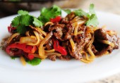 Говяжий стейк, маринованный в соевом соусе с хересом, чесноком и специями и обжаренный в масле, с луком, сладким перцем и халапеньо.