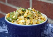 Салат из острого маринованного перца халапеньо и анахейм с кукурузой, приготовленной на гриле, заправленный йогуртовым соусом со специями.