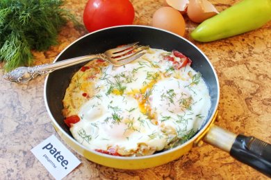 Яичница с перцем, помидорами и луком