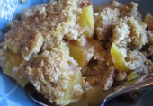 Запеченная овсянка с пшеницей, молоком, сиропом и яблочным соусом, с начинкой из консервированных персиков.