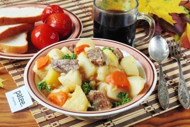 Говяжья солонина и овощи, приготовленные в бульоне с пивом Гиннесс и коричневым сахаром.