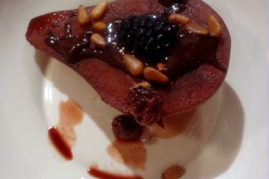 Хрустящие и сладкие груши, запеченные в духовке и замаринованные в красном десертном вине с корицей, сычуаньским перцем, сушеными вишнями и плодами звездчатого аниса.