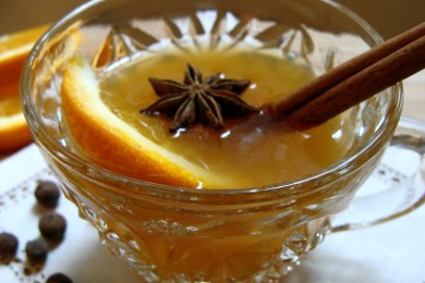 Горячий сидр с анисом, душистым перцем, палочками корицы и апельсином.