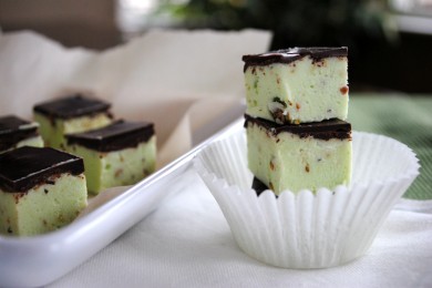 Сливочная помадка из смеси для фисташкового пудинга, зефирного крема, белого шоколада и фисташек, политая темным шоколадом.