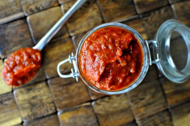 Простой рецепт соуса для пиццы из томатной пасты с вялеными помидорами, чесноком, белым вином, сушеной зеленью и специями.