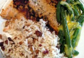 Филе лосося, посыпанное приправой для рыбы и обжаренное на кунжутном масле. Подавайте с рисом и пеканом.