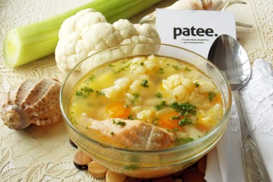 Легкий, но очень сытный и вкусный суп. Нежный бульон из форели хорошо сочетается с целым набором овощей: цветной капустой, луком- пореем, корневым сельдереем, морковью и картофелем.