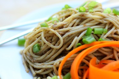 Спагетти в соусе из чеснока с луком, арахисовым маслом, соевым соусом, рисовым уксусом и вином. Подавайте пасту с тертой морковью, арахисом и зеленым луком.