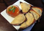 Пшеничные лепешки с начинкой из черной фасоли, творога и тертого сыра под соусом из томата с чили и чесноком.