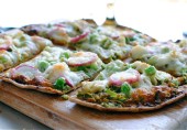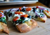 Пицца на пшеничных лепешках со шпинатом, помидорами, сыром, оливками и луком.