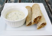 Лепешки такос с курицей внутри и с соусом из лимонного сока, свежей кинзы и чеснока. Очень вкусная закуска!