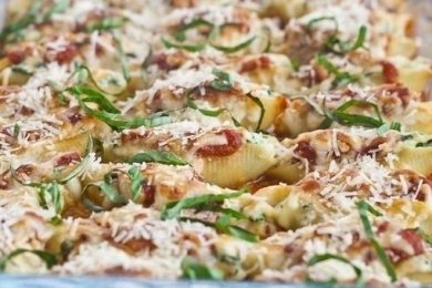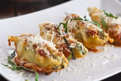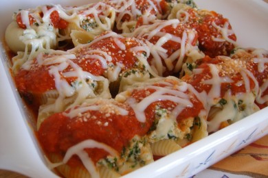 Ракушки, фаршированные смесью сыра, творога и шпината, посыпанные моцареллой и запеченные в духовке в соусе маринара.