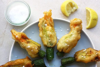 Цветки цуккини в кляре с сыром рикотта и лимонным соком