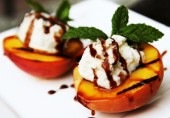 Персики, обжаренные на гриле, с начинкой из сыра рикотта, побрызганные бальзамическим соусом.