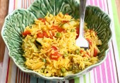 Рис басмати с помидорами, цуккини, зеленым горошком, приправленный травами и куркумой.