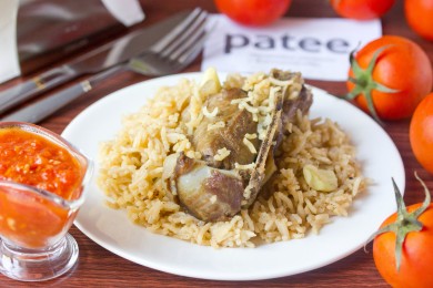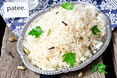 Рис басмати, пропитанный вкусом корицы, гвоздики, кардамона, тнима и лаврового листа. Можно подавать с любыми мясными блюдами.