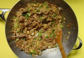 Суп из обжаренного говяжьего фарша с коричневым рисом, зеленым перцем и консервированными помидорами.