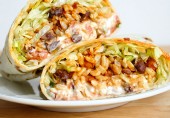 Пшеничные лепешки с начинкой из фасоли с рисом, перцем чипотле, чесноком и специями, посыпанной тертым сыром, зеленым луком и латуком.