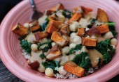 Коричневый рис с запеченным сладким картофелем, нутом и капустой кале, политые арахисовым соусом с уксусом и специями.
