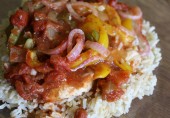 Куриное филе, запеченное с сальсой, сладким перцем, халапеньо и луком. Подавайте с коричневым рисом.