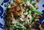 Коричневый рис, приготовленный на белом вине, с зеленой фасолью, грибами, капустой кале и карамелизованным луком.