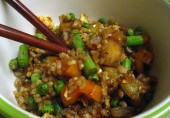 Коричневый рис с яйцом, баклажаном, зеленым горошком, стручковой фасолью и сладким перцем. Можно подавать с соусом шрирача или другим острым соусом.