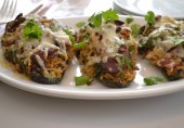 Мексиканский перец поблано с начинкой из коричневого риса с фасолью и специями, посыпанный жареным беконом и тертым острым чеддером и запеченный в духовке.