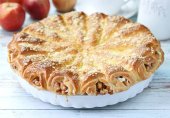 Чизкейк с основой из измельченных вафельных рожков с маслом, сливочно-ванильной начинкой и яблоками. При желании яблоки можно заменить любыми другими консервированными фруктами или ягодами.