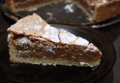 Пирог двухслойный, состоит из несладкой основы из рубленого теста и орехового верха, а на вид и вкус кажется трехслойным из-за того, что ореховая начинка внутри слегка тягучая, а сверху получается хрустящая сладкая корочка.