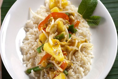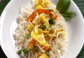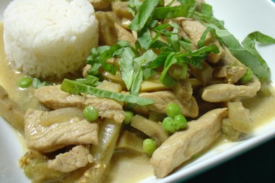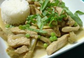 Свиное филе, баклажан, горошек и бамбуковые ростки в удивительном соусе с кокосовым молоком и карри.