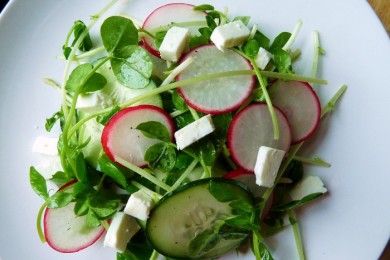 Салат с ростками гороха и редисом под соусом из лимонного сока и оливкового масла.
