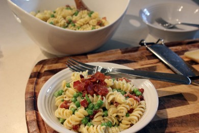 Вкусная паста со сливочно-чесночным соусом с добавлением бекона, зеленого горошка и сыра Пармезан.