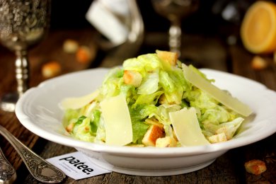 Салат “Цезарь” полностью оправдывает своё величественное название! Его популярность не знает границ- по всему миру салат “Цезарь” славится своими вкусовыми характеристиками, меню любого уважающего себя ресторана содержит в себе этот изысканный салат со сложным соусом.