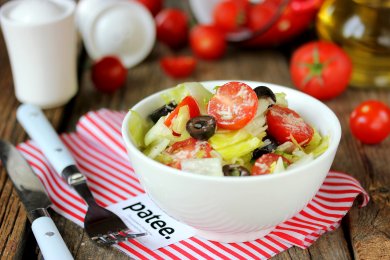 Готовим вкусный летний салат из листьев хрустящего айсберга, помидоров черри, маслин и тёртого пармезана.